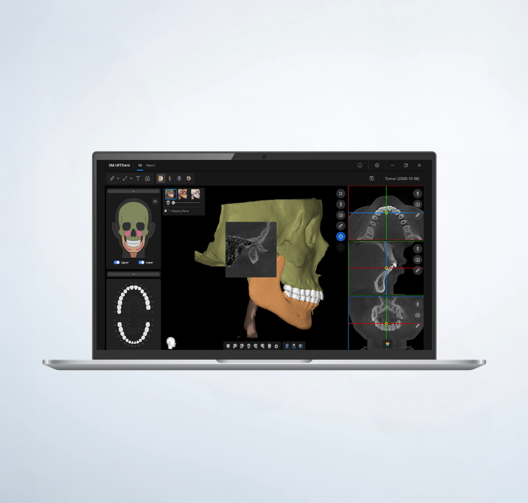 Compatible avec les fichiers DICOM CBCT, STL/OBJ scans faciaux, et export vers plateformes CAO, chirurgiens‑généralistes et laboratoires.