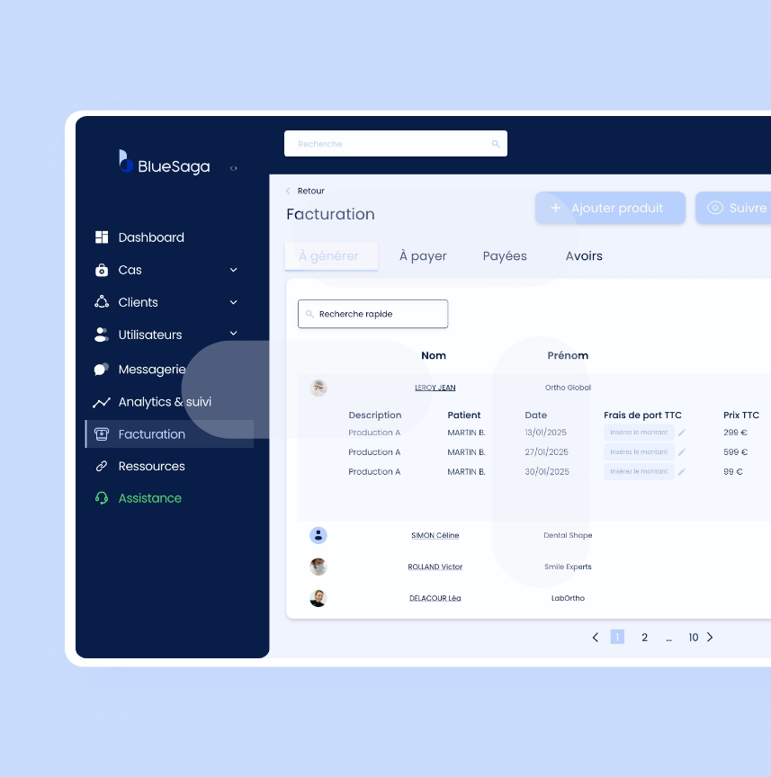 Pensée avec et pour les laboratoires dentaires, BlueSaga transforme vos échanges avec les cabinets et structure vos processus de production. Des outils puissants pour piloter simplement votre activité.